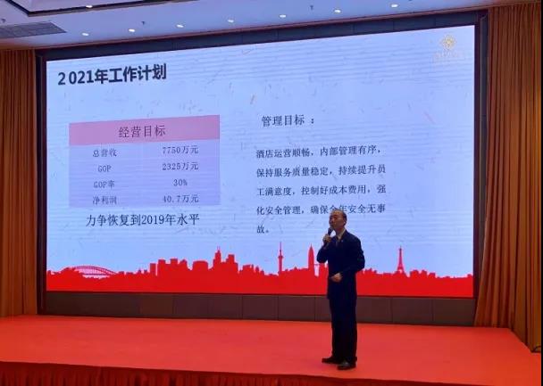 在對2020年度工作全面總結(jié)中,酒店經(jīng)營班子肯定了全體員工在過去一年的辛勤付出和取得的經(jīng)營成效,并對2021年度工作目標進行了部署和動員。