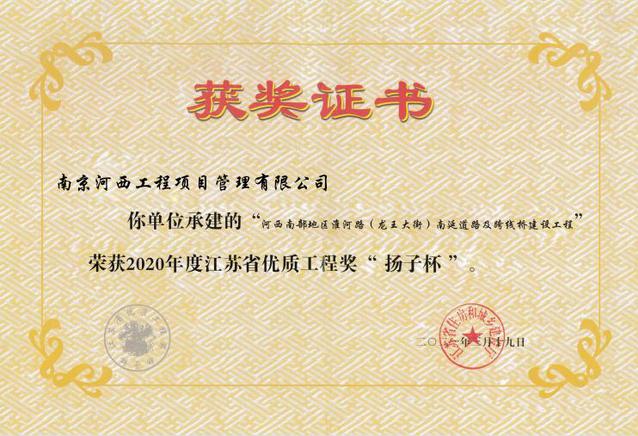 龍王大街項(xiàng)目“揚(yáng)子杯”證書(shū)
