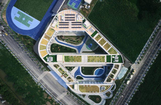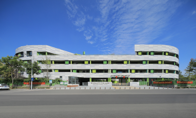 河西新城四小位于南京市建鄴區(qū)江山大街以北、黃山路以東,建筑面積2.79萬平方米,教學樓主體4層,局部3層,地下1層,建筑高度16.95米,可容納教職工和學生1705人。建筑整體采用扁平化“曰”字形結構,包含傳道授業(yè)的教學理念,造型可演化為鉛筆、書籍、綠葉,寓意在學習中獲得知識、不斷成長。