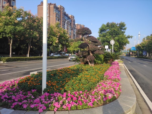 水韻路中分帶的花球也換上了新裝,10個(gè)巨大的牽牛花球被紅黃色的花帶簇?fù)碇?,在太陽下盡情地綻放著,像是小孩的笑臉,歡快地為祖國母親慶生。