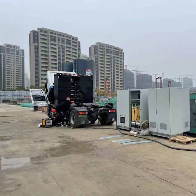 受接入的施工用電線路功率限制,現(xiàn)有配電箱無法滿足新增打樁設(shè)備用電需求。按常規(guī)做法需增設(shè)柴油發(fā)電機(jī),但此類型發(fā)電機(jī)噪音大,排放高溫廢氣,不符合現(xiàn)代社會節(jié)能環(huán)保的大趨勢。因此,本項目率先引進(jìn)無噪音、無廢氣排放的鋰電移動儲能動力站與施工用電線路并網(wǎng),在施工用電低谷期間進(jìn)行電池充電,樁基施工用電高峰期間補充電力缺口。如接入的施工用電線路長期滿載,可由儲能動力站廠家運送滿電電池進(jìn)行現(xiàn)場換電,將缺電電池運回充電。