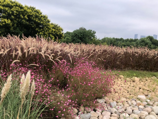 紫金文創(chuàng)園屋頂花園提升項(xiàng)目將植物配置進(jìn)行全面提檔升級,把原有枯黃退化、高低不平的狗牙根草地進(jìn)行翻新整地,栽植了薄雪萬年草,紅葉景天,粉黛亂子草、紫穗狼尾草等灌木和草本植物,既保證了屋頂承重的要求,又形成了野趣的屋頂景觀效果。