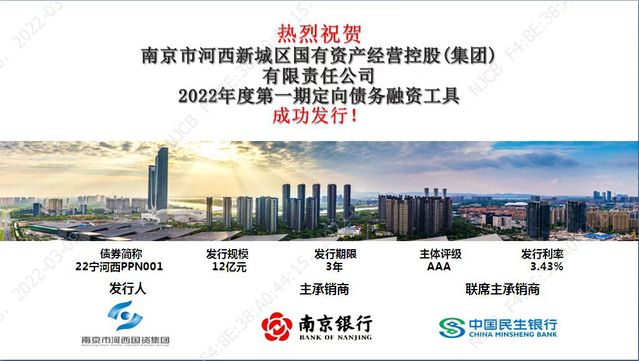 3月9日,南京市河西新城區(qū)國有資產(chǎn)經(jīng)營控股(集團)有限責任公司(以下簡稱“河西集團”)成功發(fā)行2022年度第一期定向債務融資工具。